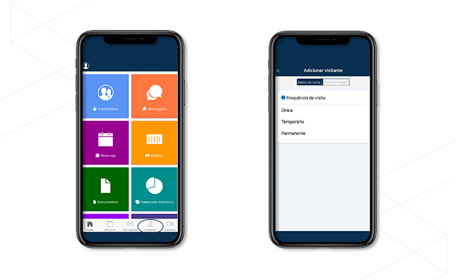 Clique na opção “Visitante” na barra inferior do seu aplicativo. Escolha a frequência da visita “Única, Temporário ou Permanente”. Preencha os dados do visitante, se deseja ser notificado quando a pessoa chegar, e se deseja gerar uma chave virtual para o acesso. E, clique em enviar.